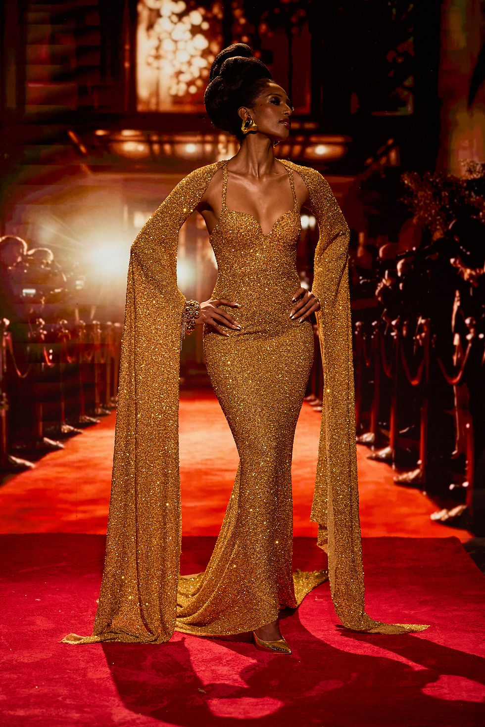 GOLD BEADED CROSS STRAP GOWN W/ DETACHABLE TRUMPET SLEEEVES
