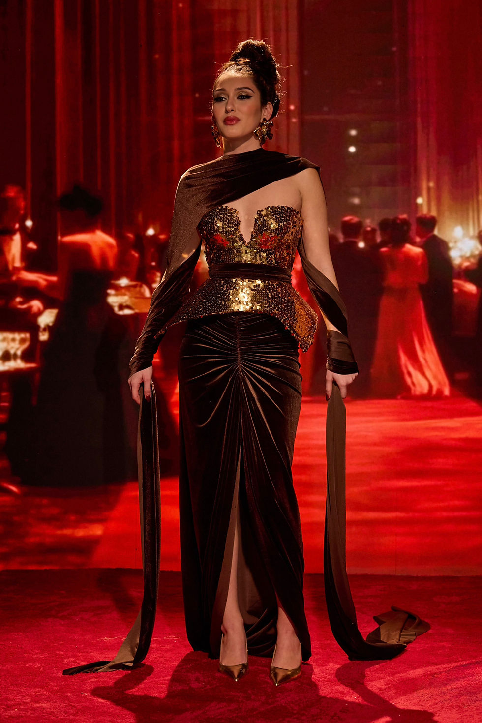 GOLD PAILLETTE SULPTURED CORSET W/ VELVET SKIRT
